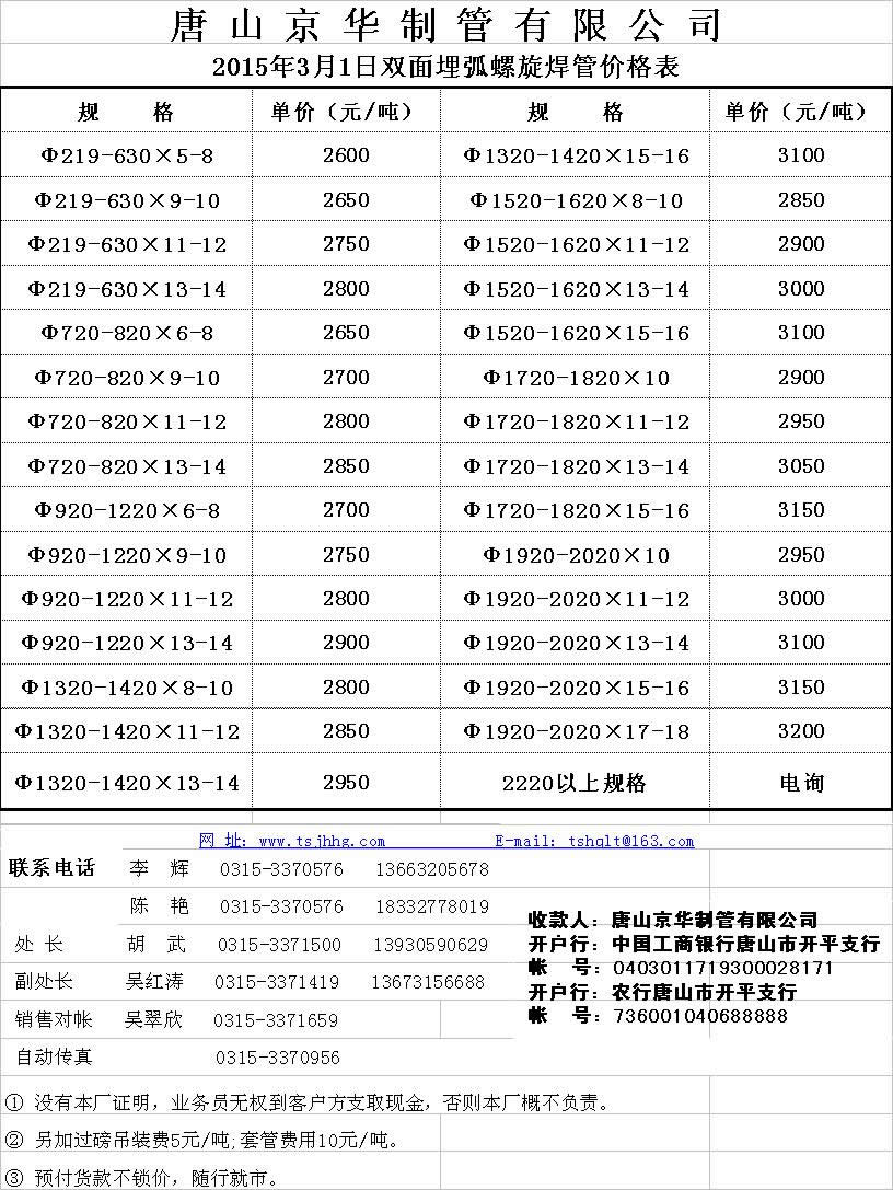 唐山京华2015年3月1日双面埋弧螺旋焊管价格表