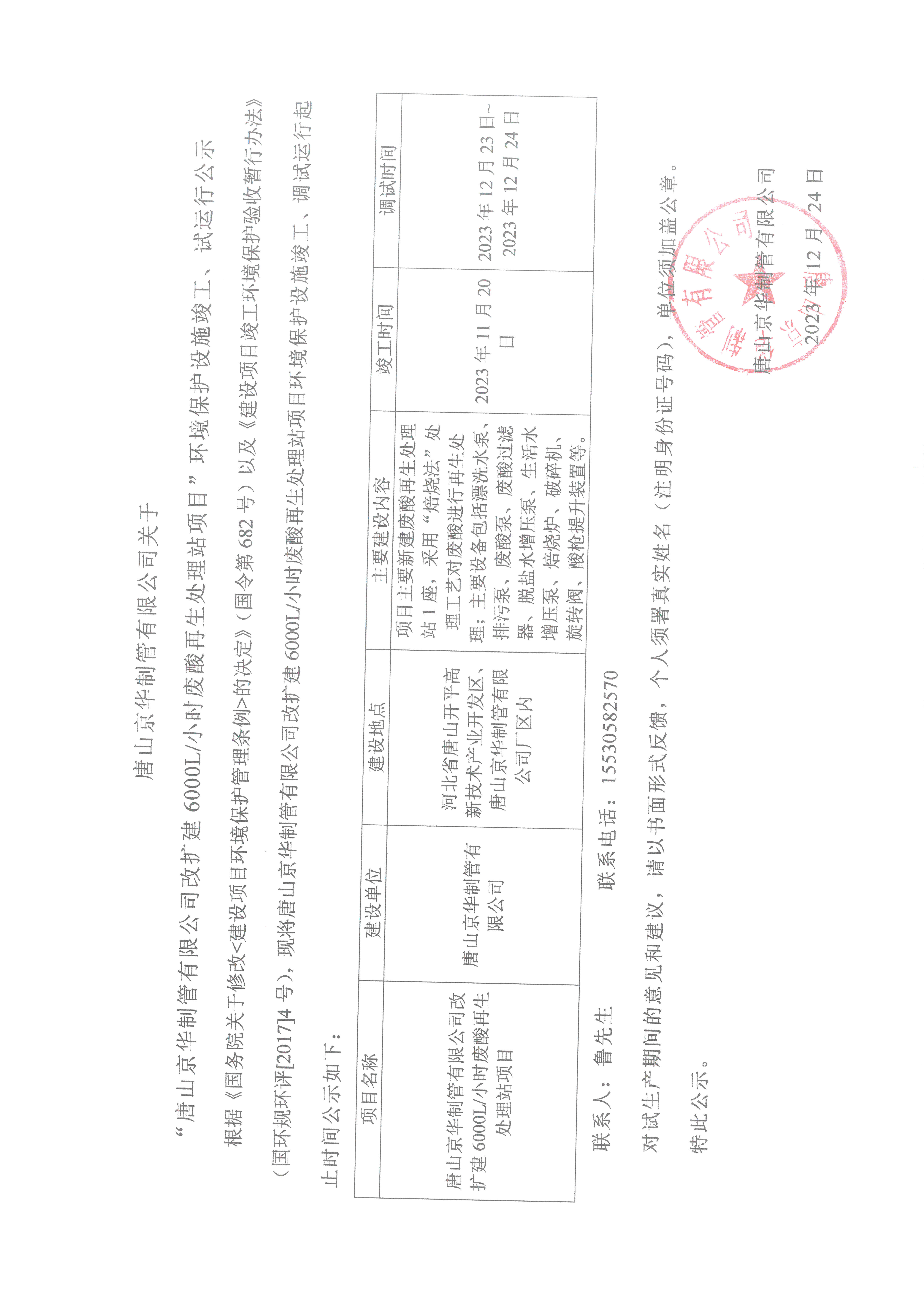 OD手机版关于“OD手机版改扩建6000L每小时废酸再生处理站项目”环境保护设施竣工、试运行公示