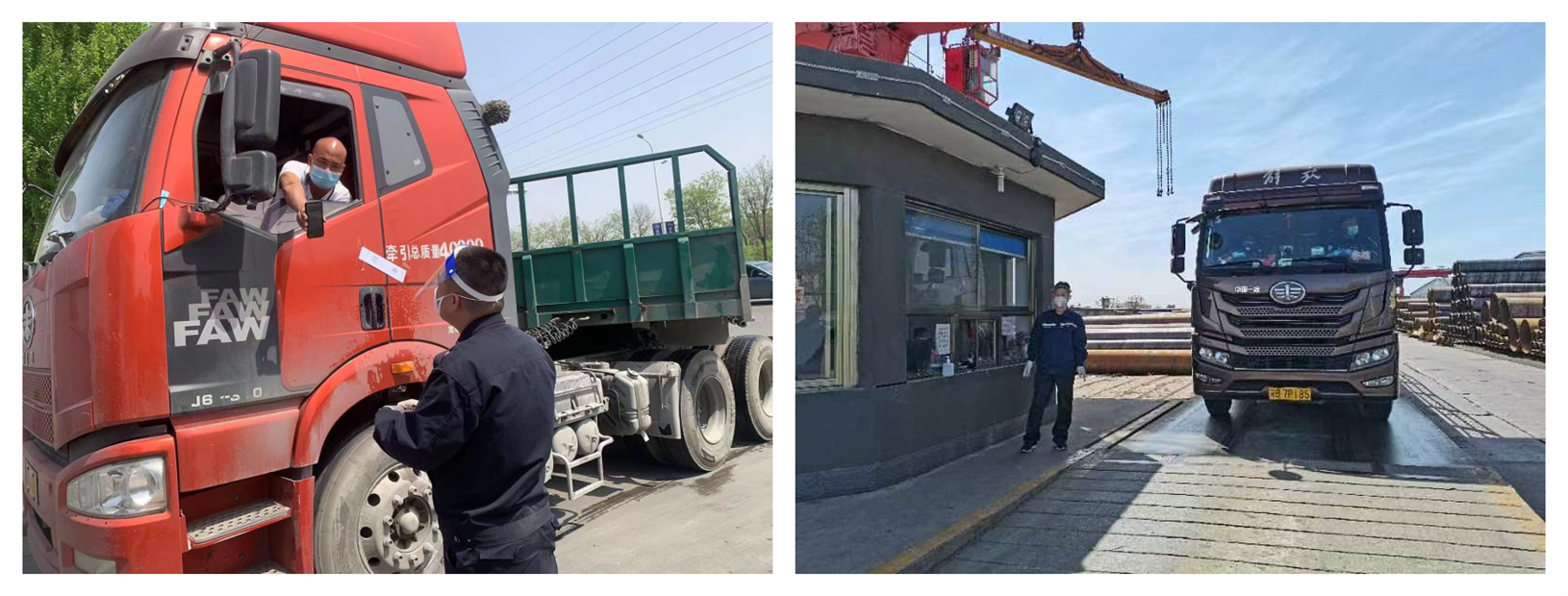 车辆进出厂区过磅时,公司安排专人负责扫码、传递单据,单据放在方便袋内系在运输车辆门把手上。出厂时在门岗处由保卫人员取下单据,查验货物出厂,全程与司乘人员保持零接触。